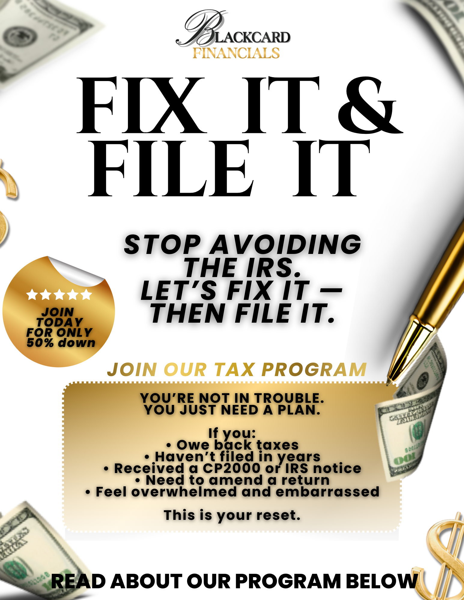 Fix It & File It™ is structured tax resolution support designed to help you get compliant, reduce stress, and move forward with a clear plan.